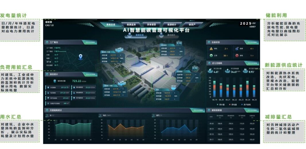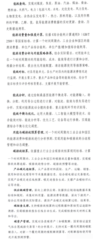 碳排放核算。依据重点行业企业碳排放核算规则标准,计算一个时间周期内,工业企业和园区的碳排放总量和强度,实现碳排放来源追踪、碳排放趋势分析、超排放预警等功能。